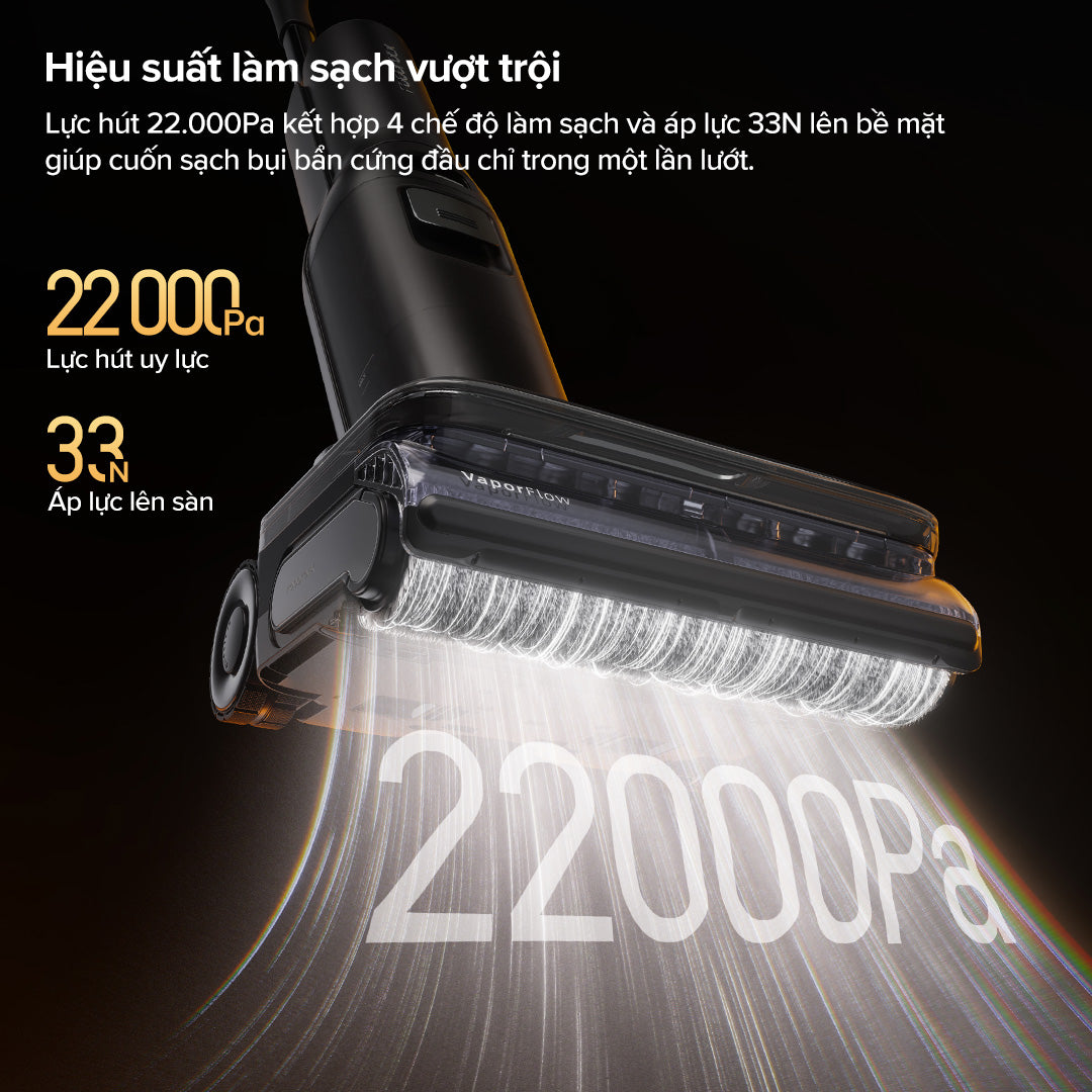 Roborock F25 Ultra có lực hút mạnh mẽ 22.000 Pa, dễ dàng làm sạch bụi bẩn trên nhiều bề mặt. Thiết kế gập 180° giúp luồn lách linh hoạt, kết hợp bánh xe trợ lực AI và con lăn chống rối, cho trải nghiệm sử dụng nhẹ nhàng hơn. Máy còn đi kèm dock sạc thông minh, tự động giặt và sấy khô con lăn ở nhiệt độ cao, giữ thiết bị luôn sạch sẽ.